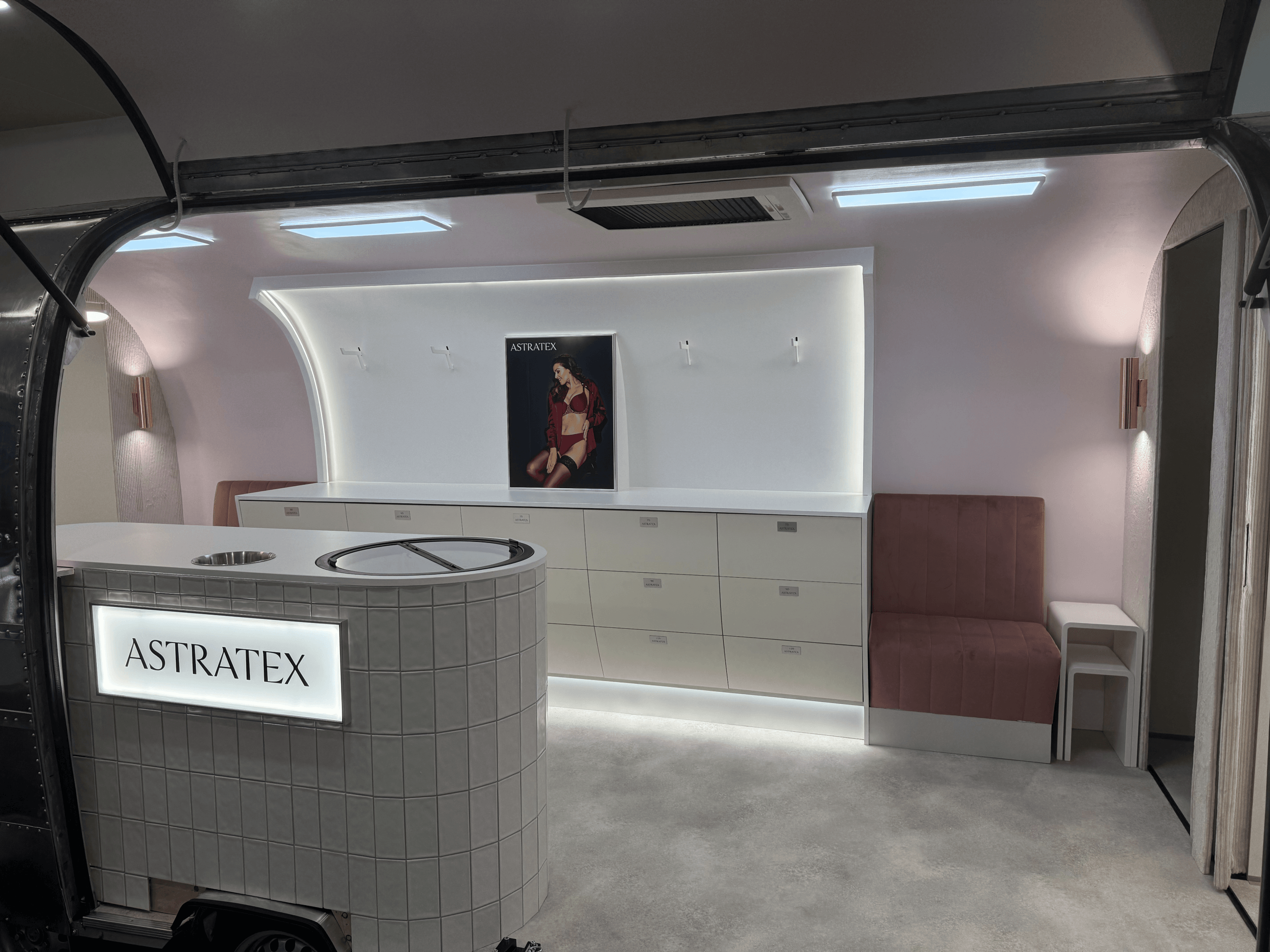 We designed a modern mobile showroom for Astratex that blends elegant design with practical functionality.